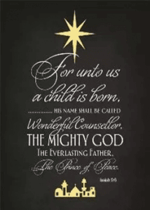 “Do not be afraid. I bring you good news of great joy that will be for all the people. Today in the town of David a Saviour has been born to you. He is Christ and Lord. This will be a sign to you, you will find a baby wrapped in cloths and lying in a manger.”